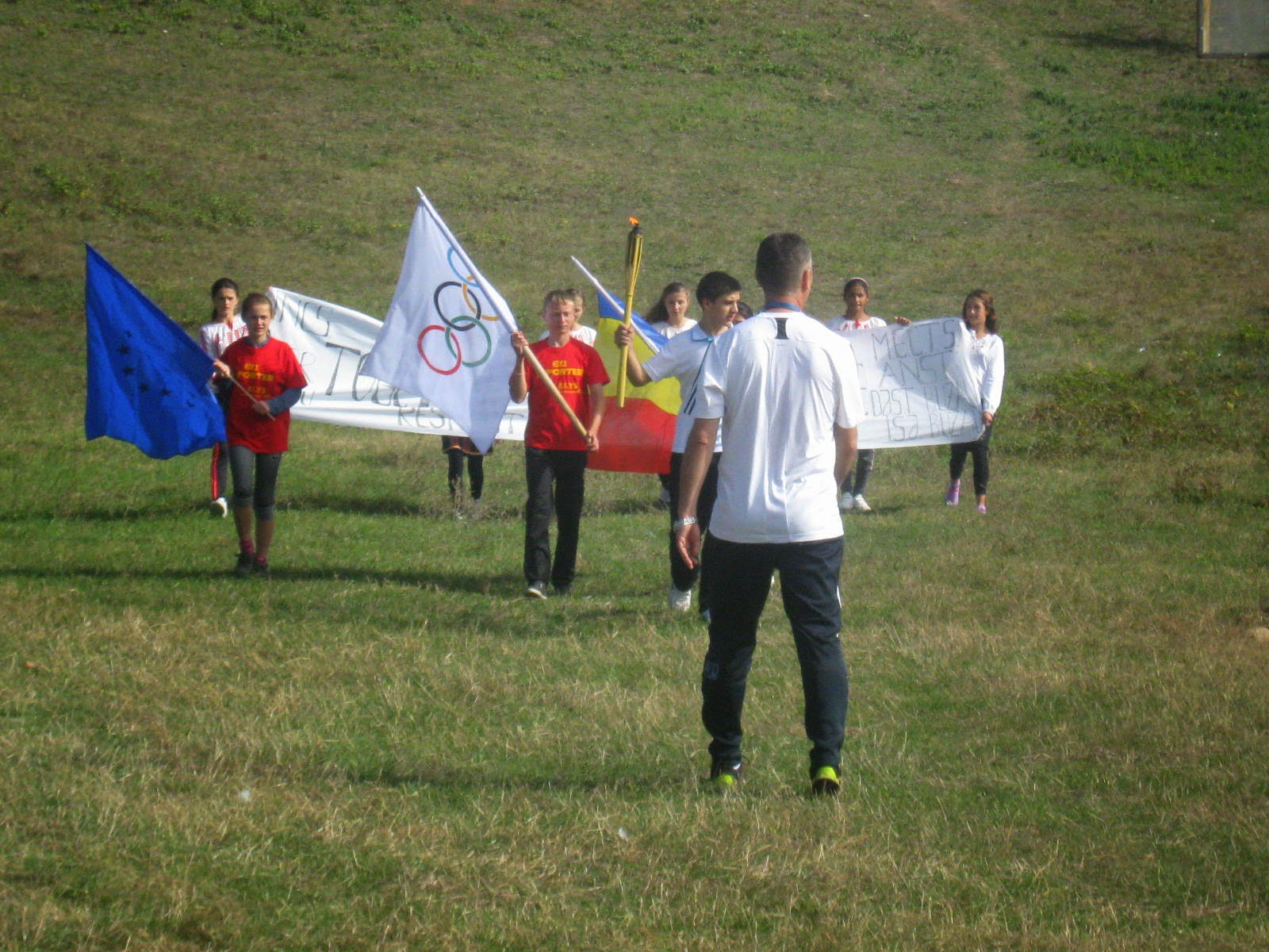 Sosirea grupului de elevi cu drapelele României, U.E., Olimpic şi cu bannerul având mesajul