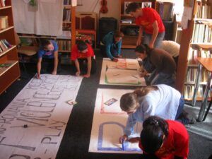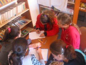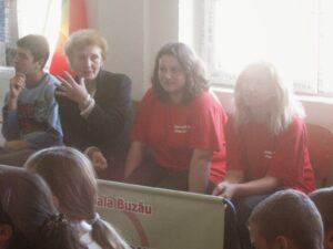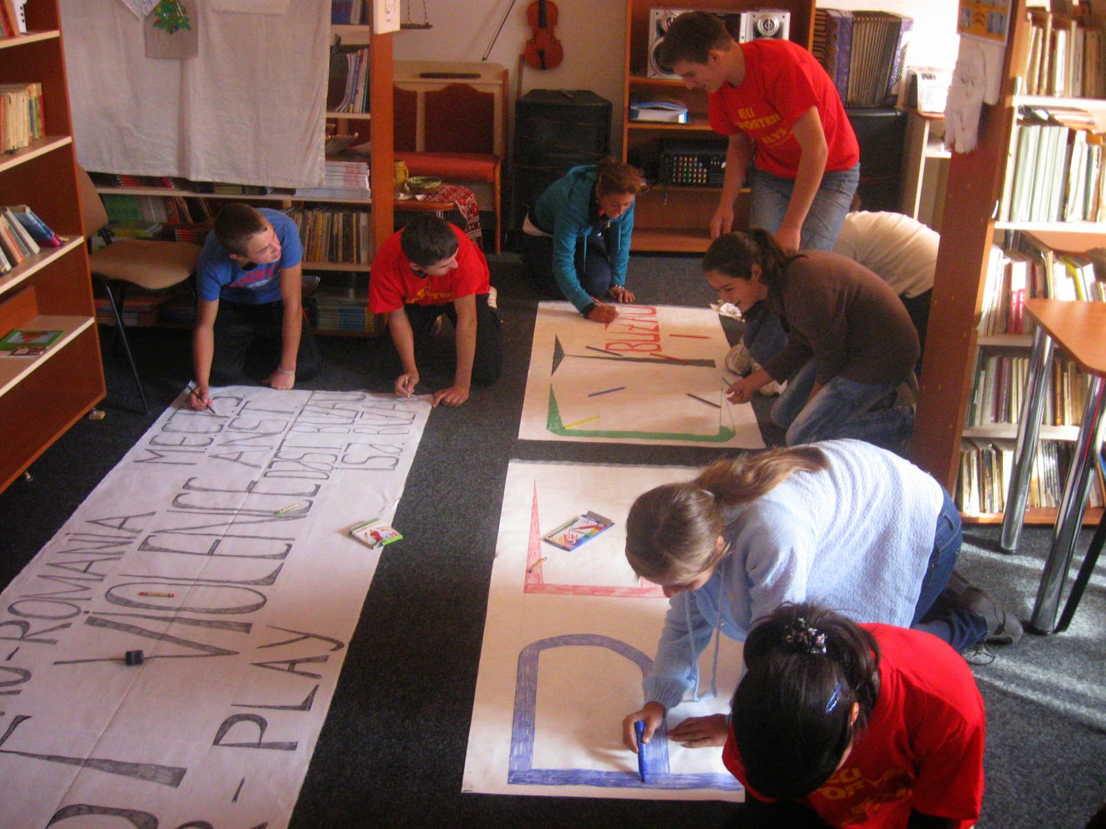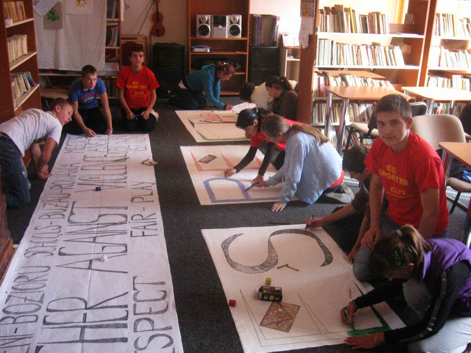 În Centrul de Documentare şi Informare unde elevii pregătesc bannerele acţiunii, coordonator –